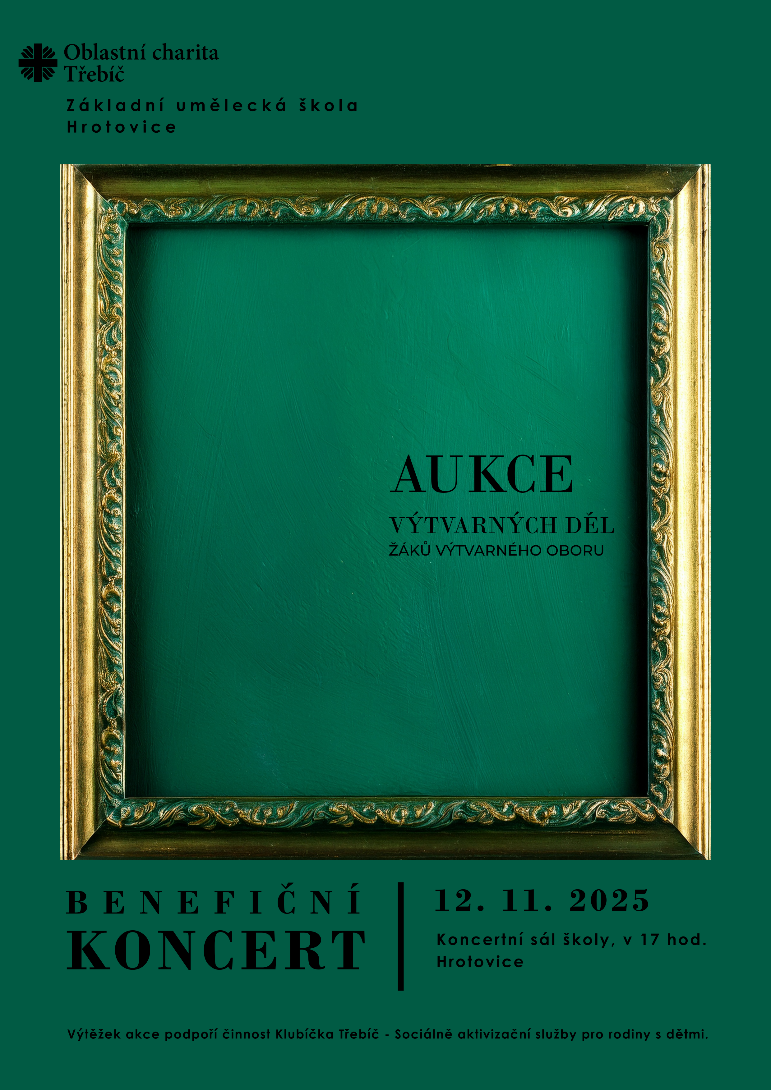 Hudební vystoupení našich žáků se tentokrát propojí s dobrým skutkem – po koncertě proběhne aukce výtvarných prací našich žáků, jejichž výtěžek bude věnován organizaci Klubíčko, sociálně aktivizační službě pro rodiny s dětmi. Děti tak pomohou nejen dětem, ale i celým rodinám, které podporu potřebují.